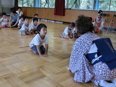 まずは、習い事での作法の一つ、「お辞儀により挨拶」ですが、本園のこども達は、興味津々。わざわざ、先生の前まで出てきてしっかりとできました。