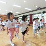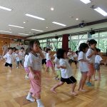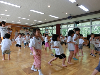アフリカの大自然の中で生まれた素朴で力強いリズムに、子どもたちの気分も一気にノリノリになりました。ムロさんの真似をしてポーズをしたり、リズムをゲームをしたりして大いに楽しみました。