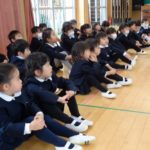 きく(年少)・ききょう(年長)は「星に願いを」、さくら(年中)は「皇帝ワルツ」のメロディーに合わせて前後左右にステップし、右に左に回転し、さらには回転した後に手拍子するという動きをしましたが、親子で楽しそうに踊ることができました。