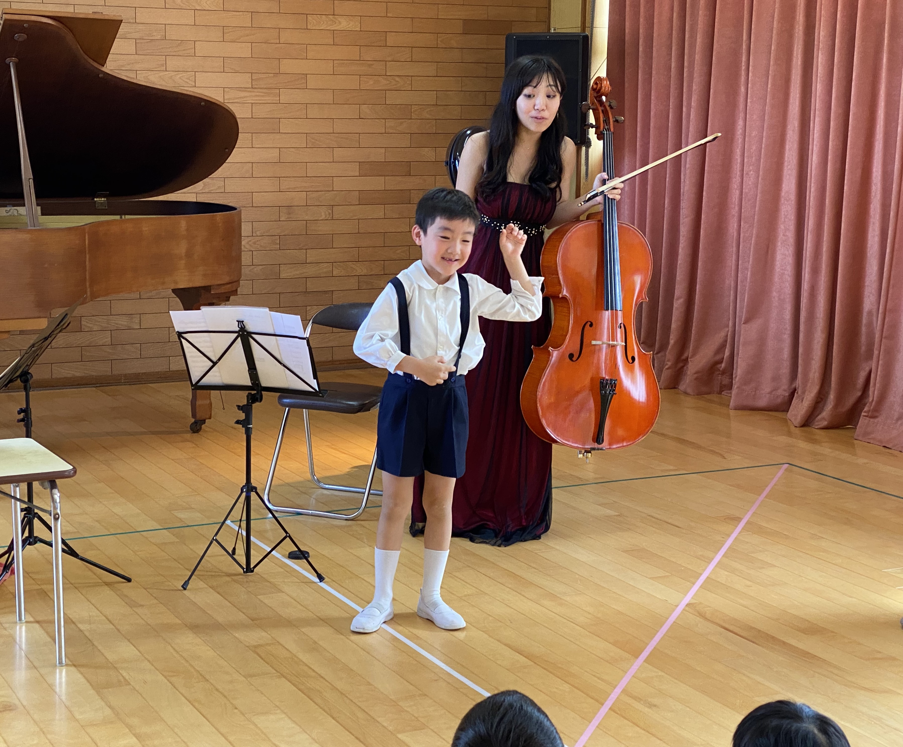 「チェロはどんなふうに弾くか知っている子?」と聞くと「ハイ!」と前に出てきて身振りをやってくれました。