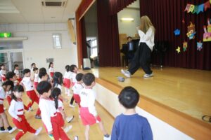前後左右に移動したり、ジャンプしたり、右に左にスライドしたり、腕もウェーブしながら動かしたりと激しい動きだけれども楽しそうでした。「もっと踊りたーい」という子どもたちの声も聞かれるほどやる気満々!